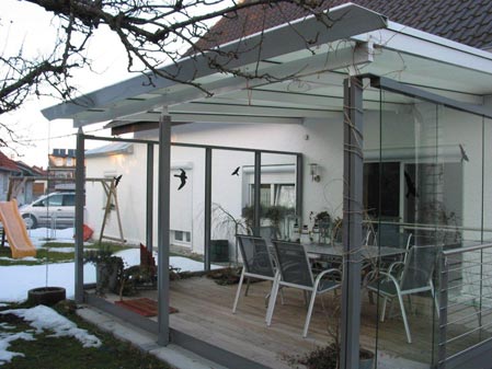 Die Terrase besteht an den Wetter zugewandten Seiten aus Glaselementen. Die Holzbeplankung wird von einer Aluminium Unterkonstruktion getragen. Für die Dacheindeckung wurden Sonderglaselemente verwendet die trotz direkter Sonneinstrahlung "kühlend" wirken.